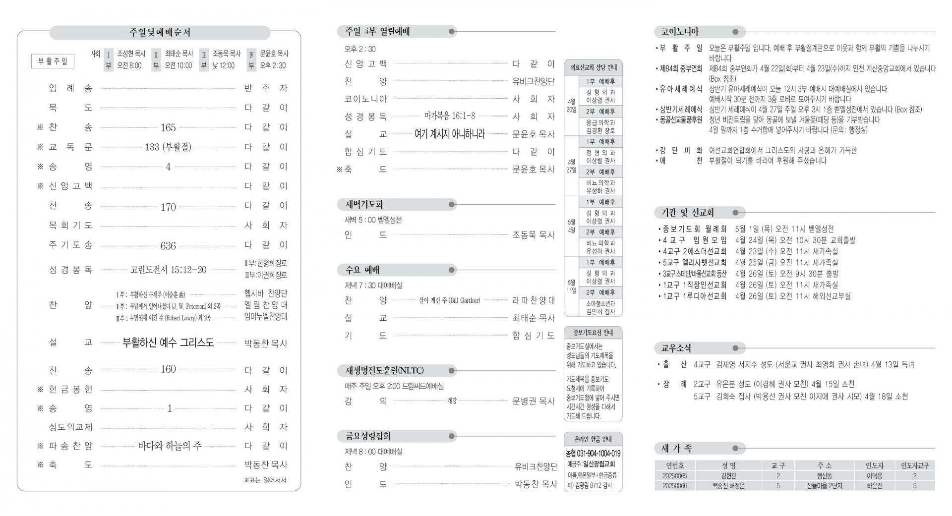 - 장 례: 2교구 유은분 성도 (이경혜 권사 모친) 4월 15일 소천 5교구 김희숙 집사 (박용선 권사 모친 이지애 권사 시모) 4월 18일 소천