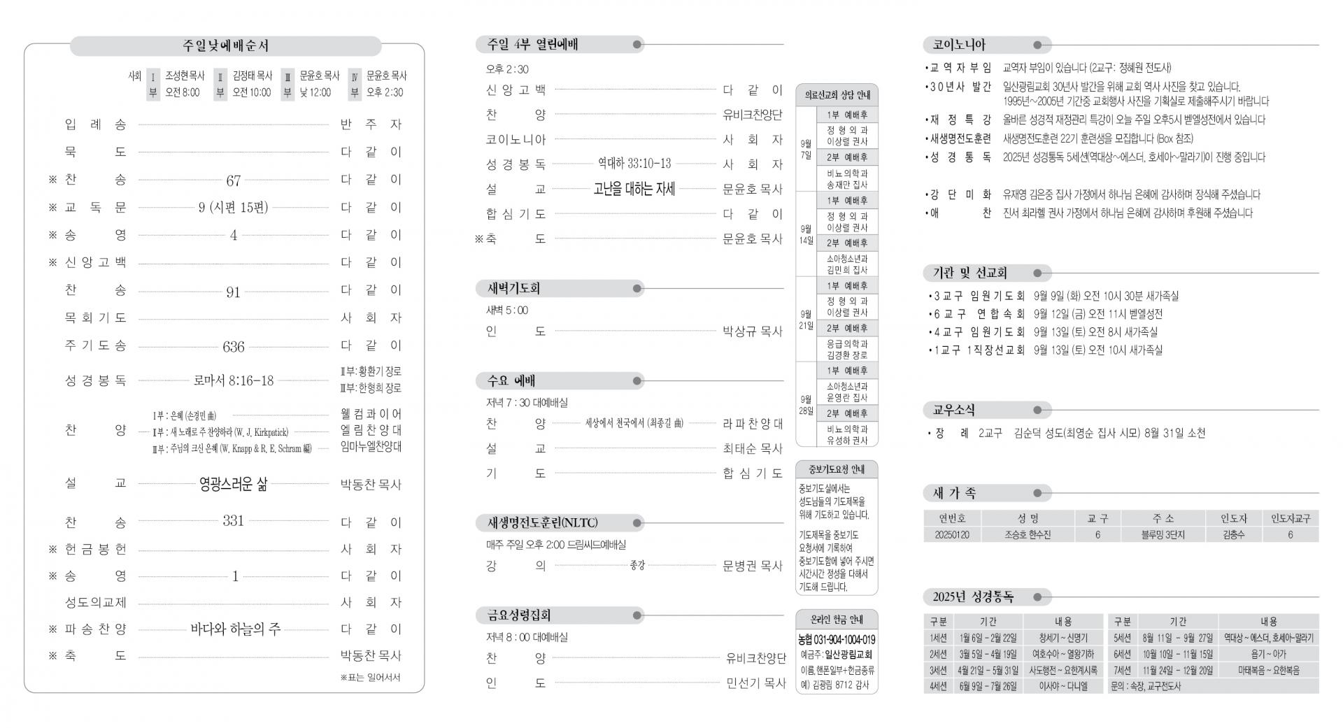 - 성경통독: 2025년 성경통독 5세션(역대상~에스더, 호세아~말라기)이 진행 중입니다