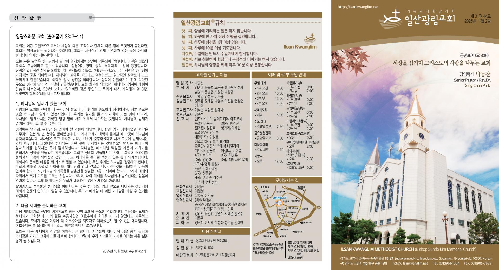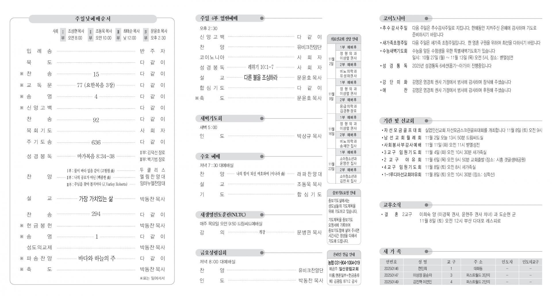 - 추수감사주일: 다음 주일은 추수감사주일로 지킵니다. 한해동안 지켜주신 은혜에 감사하며 기도로 준비하시기 바랍니다